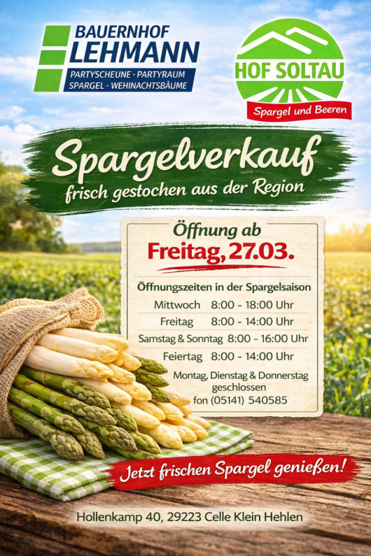 Seit 2004 arbeiten wir in der Spargelproduktion und -vermarktung mit dem Hof Soltau aus Eicklingen (www.hof-soltau.de) zusammen. Unsere Wurzeln im Spargelanbau reichen jedoch bis ins Jahr 1911 zurück – als erster Betrieb im Celler Land bauten wir damals Spargel an. Diese über Generationen gewachsene Erfahrung ist die Grundlage für die herausragende Qualität, die unser Edelgemüse von „Bauer Lehmann“ auszeichnet.